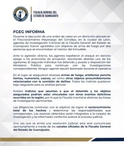 León, Gto., 6 de noviembre de 2025. A través de un boletín escaneado, la Fiscalía General del Estado de Guanajuato (FGE) da a conocer elementos de la Agencia de Investigación Criminal abatieron a uno de dos sujetos que los agredieron a balazos.