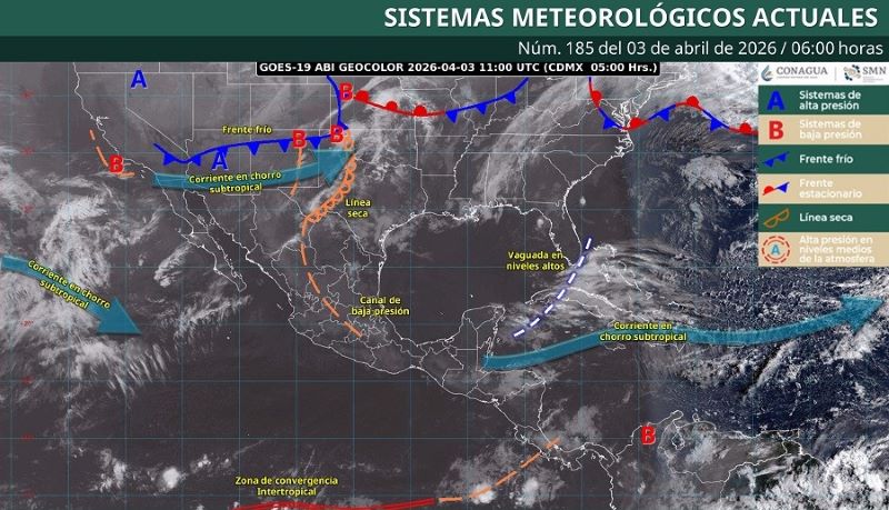 CDMX 3 de abril de 2026.- Este día un nuevo frente frío, el número 43, se extenderá cerca de la frontera noroeste y norte del país, interaccionará con una línea seca, originando chubascos y lluvias fuertes acompañadas con descargas eléctricas y probables granizadas en Coahuila, Nuevo León, Tamaulipas y San Luis Potosí; además, se prevén rachas de viento de 60 a 80 km/h y posible formación de torbellinos o tornados en el norte de Coahuila, Nuevo León y Tamaulipas.