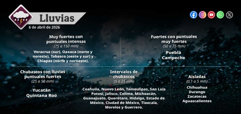 CDMX 6 de abril de 2026.- El Servicio Meteorológico Nacional pronostica que para hoy el frente frío número 43 se extenderá sobre el golfo de México y continuará interactuando con una vaguada en altura y con la corriente en chorro subtropical, propiciando lluvias puntuales intensas en Veracruz, Oaxaca, Tabasco y Chiapas; puntuales muy fuertes en Puebla y Campeche; y fuertes en Yucatán y Quintana Roo.