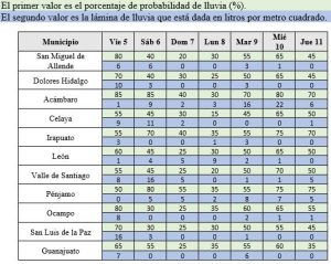 Tabla de pronóstico de lluvias, elaborada por Marcos Irineo Esquivel Longoria, coordinador del Centro de Ciencias Atmosféricas y Observatorio Meteorológico de la Universidad de Guanajuato: