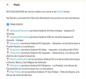 Guanajuato, Gto., 4 de diciembre de 2025.- A las 7.00 horas de este jueves la Secretaría de Seguridad y Paz (SSyP) dio a conocer que están libres de bloqueos las carreteras que hay en el estado de Guanajuato.