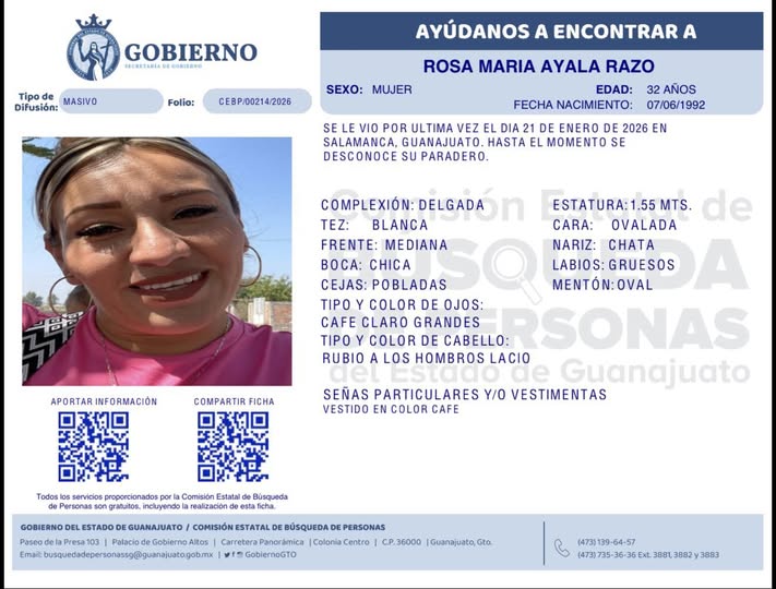 ESTADO SEGURIDAD Rosa María Ayala Razo desapareció en Salamanca; familiares y amistades claman ayuda para localizarla 13/03/2026 Rosa María Ayala Razo desapareció en Salamanca. Si tiene información de su paradero, por favor proporciónela a los teléfonos anotados en la ficha. Compartir: Post navigation Previous: En distintos ataques, mataron a balazos a dos hombres en SalamancaNext: Autoridades federales detienen en Sinaloa a uno de los 10 fugitivos más buscados por el FBI + noticias ESTADO INTERÉS GENERAL SEGURIDAD Más de 23 kilos de marihuana llevaba en dos maletas pasajero de autobús foráneo 12/04/2026 SEGURIDAD Pareja es sentenciada a 10 años de cárcel por intentar matar a tres agentes de investigación criminal en León 12/04/2026 SEGURIDAD Cuerpo de mujer sin vida y con huellas de violencia fue localizado en Silao 12/04/2026