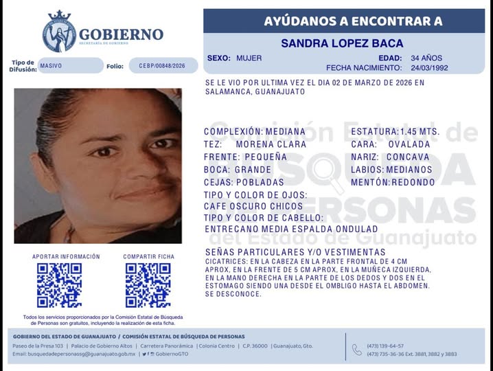 ESTADO SEGURIDAD Sandra López Vaca desapareció en Salamanca, sus familiares y amistades claman ayuda para localizarla 28/03/2026 Screenshot Si tiene información de su paradero, por favor proporciónela a los teléfonos anotados en la ficha. Compartir: Post navigation Previous: Otra víctima a la larga lista de homicidios dolosos que registra SalamancaNext: Llegaron a matarlo al interior del bar California, en Salvatierra + noticias SEGURIDAD Ataque a balazos contra maquinaria de empresa que ejecuta obras para la Junta de Agua de Celaya 16/04/2026 ESTADO INTERÉS GENERAL SEGURIDAD Vecinos de la colonia León I se enfrentan a elementos Guardia Nacional; hubo disparos de arma de fuego 16/04/2026 ESTADO INTERÉS GENERAL Recibe el IMSS Guanajuato donación multiorgánica que beneficia a cinco infantes 16/04/2026